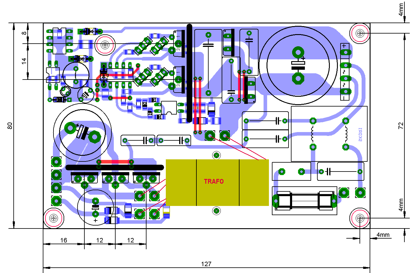 Az áramkör, mint bármely kapcsolóüzemû tápegység, meglehetõsen érzékeny a megfelelõ NYÁK-tervre,