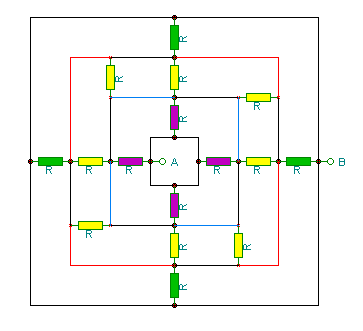 mindíg azonos potenciálon lesznek, a szimmetrikus felépítés miatt. Ha ezeket a pontokat összekötjük, attól az A-B pont közötti ellenállás nem fog megváltozni, mert az