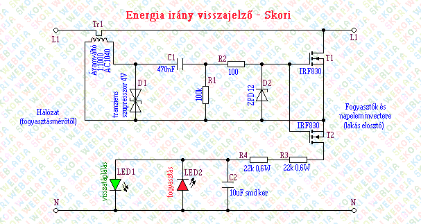 A fetni áramkört felhasználva, fogyasztás esetén a piros, visszatáplálás esetén a zöld led fog világítani. Amikor a