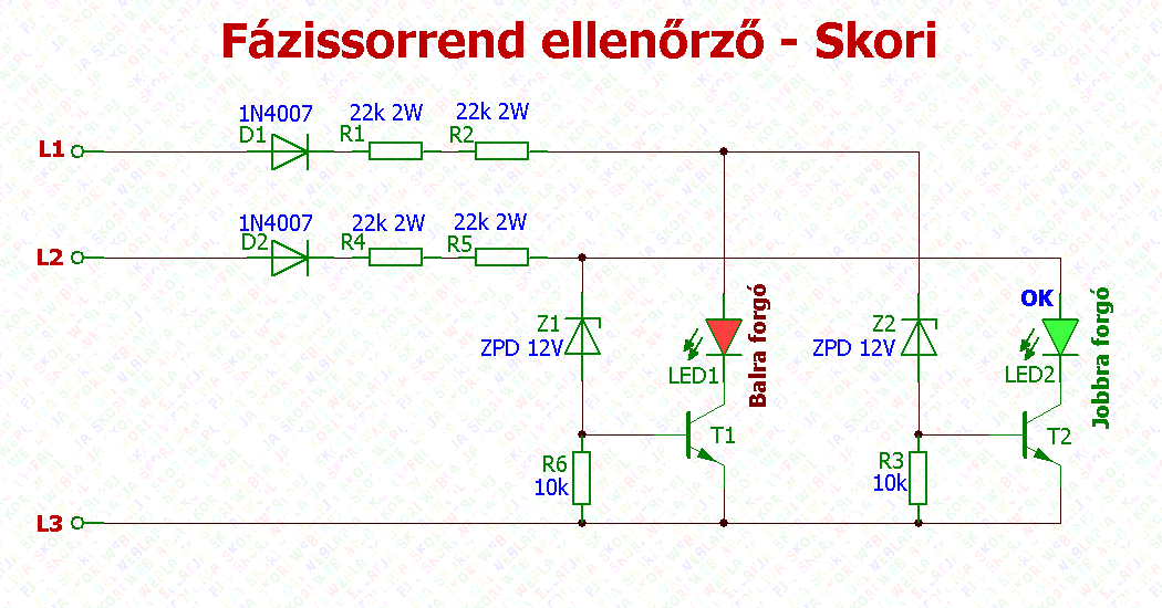 a feszülségről működtetjük, R3, R4 előtét-ellenállások felhaszálásával a két visszajelző ledet. Azért van szükség 2db ellenállásra,