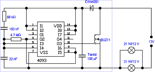 (ilyenkor a fet átvezet, és az izzók folyamatosan világítanak). Az időzítés nagysága a 4.7Mohmos ellenállás