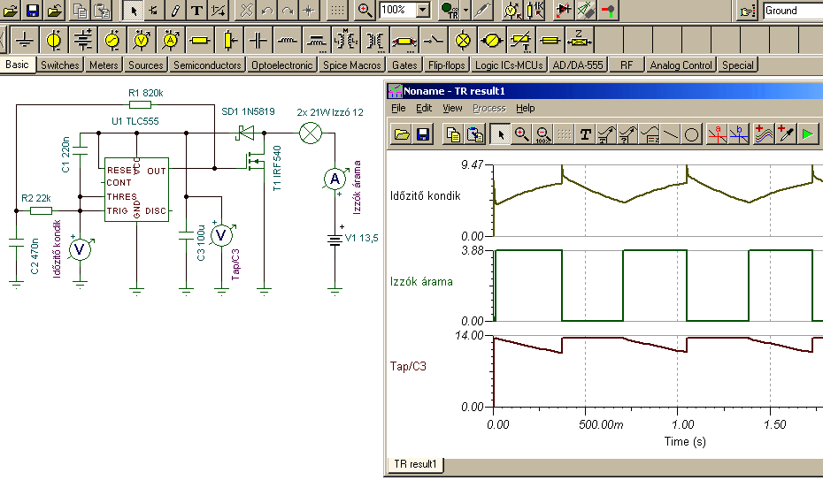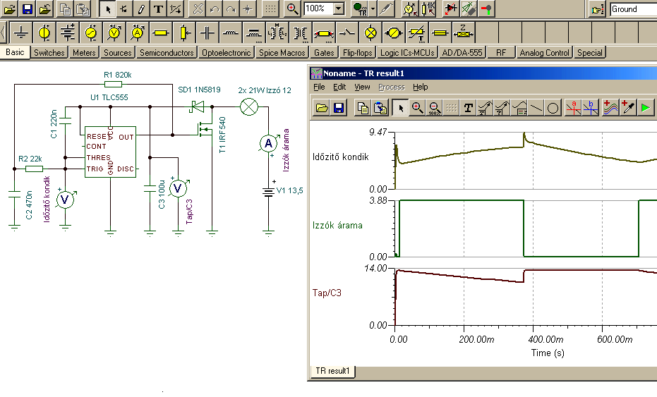 A kapcsolás így néz ki az áramkörszimulátorban: