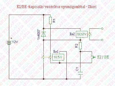 Amikor az áramkörre rákapcsoljuk a 12V-ot mindkét relé kikapcsolt állpotban van. A C1 kondi feltöltödik 12V-ra Re2 és R2 -n keresztül,