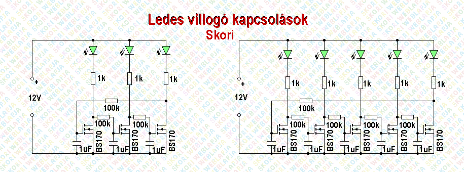 A klasszkus ledes villogó (multivibrátor kapcsolás) helyett, jópofa villogó kapcsolást építhetünk több leddel.
