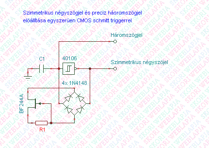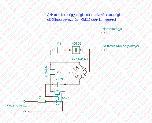 háromszögjelet is elöállít. A gyakorlatban (amennyire egyszerü annyira jó) szinte 0-tól 1...2MHz frekvenciáig szép szabályos