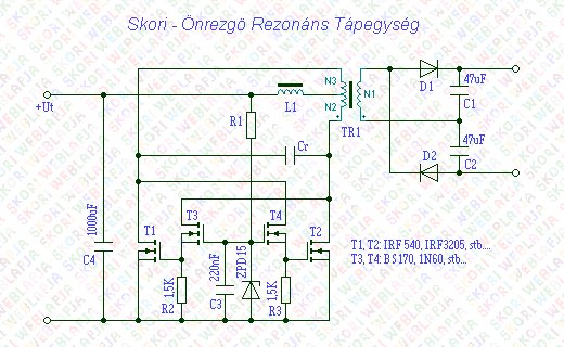árammal szinkronban nyitja ill. zárja (azaz ki/be kapcsolgatja) a T1 és T2 FET-et. Azért van szükség 2db, lényegében sorba