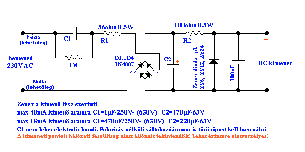 R3 és R2 0,6W-os vagy nagyobb disszipációra képes ellenállás legyen. C2 kondenzátor nem lehet elektrolit kondi, csak polaritás