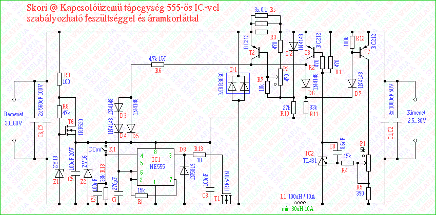 Az 555-ös IC-re épülö kapcsolóüzemü tápegység könnyen továbbfejleszthetö nagyobb be/kiemenö feszültségre és áramerösségre,