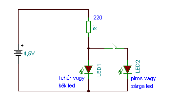 Használjunk a fenti áramkörben különbözõ szinü ledeket. Alaphelyzetben a fehér led szépen világít - remélhetõleg mindenki sejti