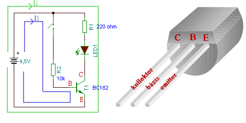kollektora alaphelyzetben nem vezet sem az emitter (sem a bázis irányába). Azonban ha a kapcsolót bekapcsoljuk akkor a rajzon I1-el jelölt áram megindul az