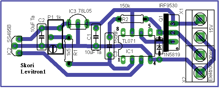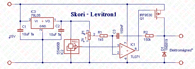 Az áramkör lényege egy elektromágnes megfelelö vezérlése. A levegöben egy állandómágnes lebeg, amely ha a