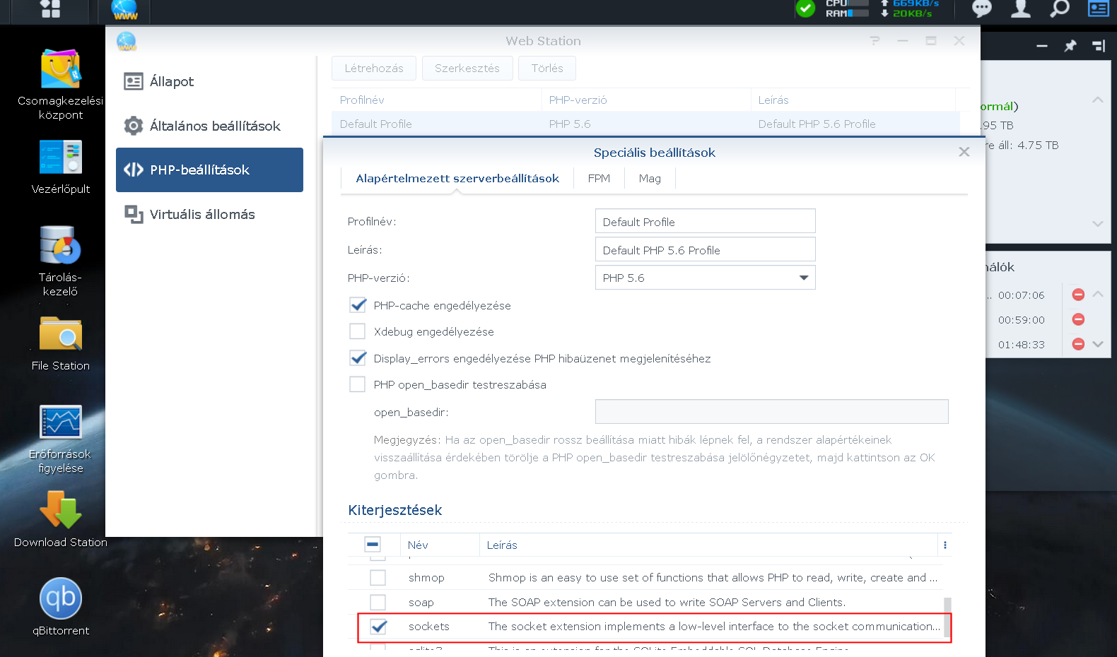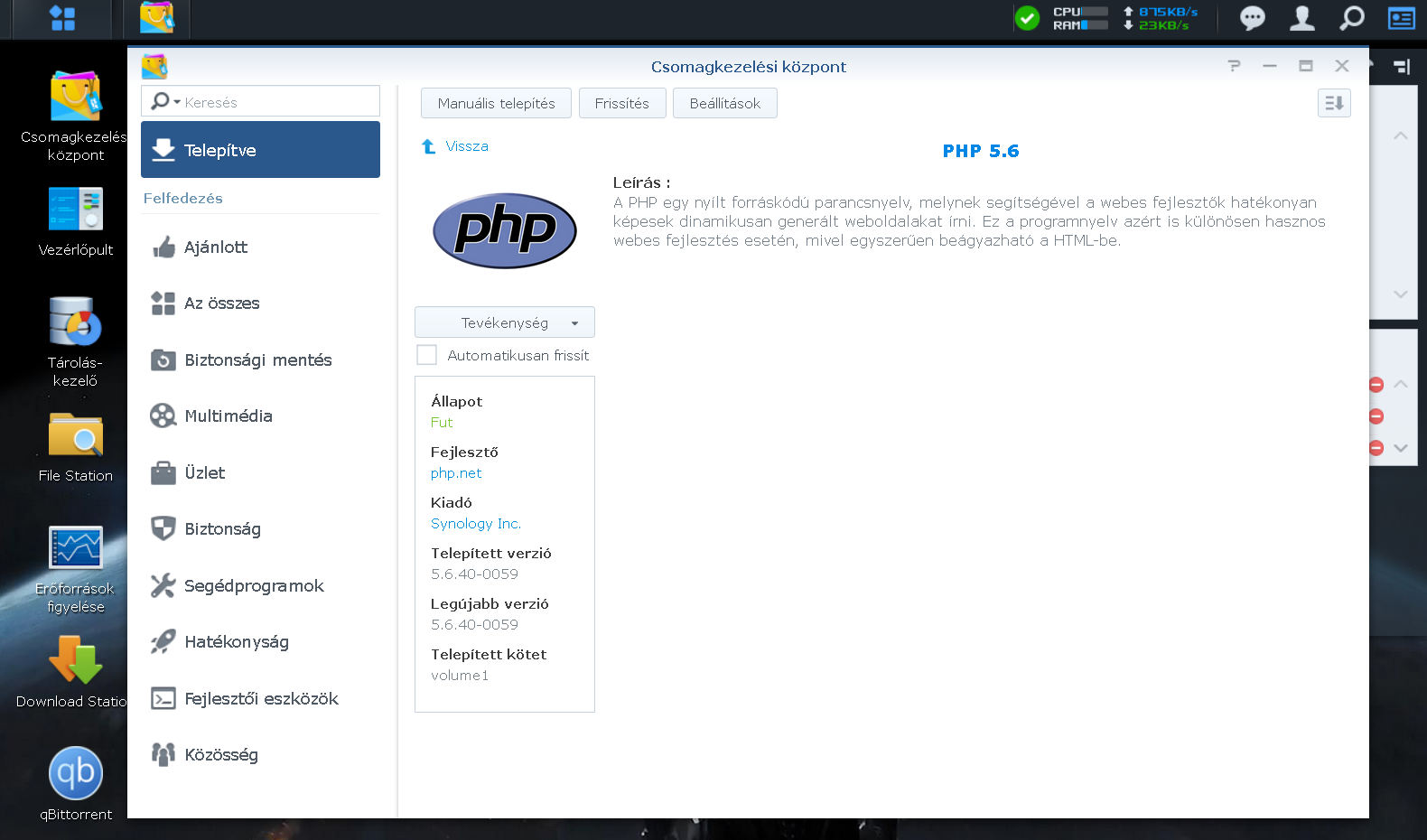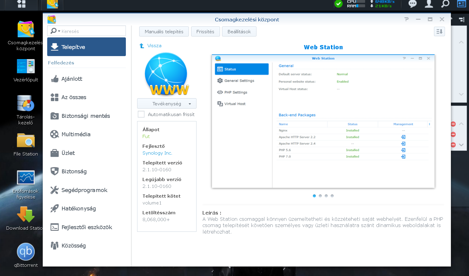 Esetemben az otthoni NAS adott volt. Erre telepítettem a Web Stationt (webszerver) és a PHP-t.