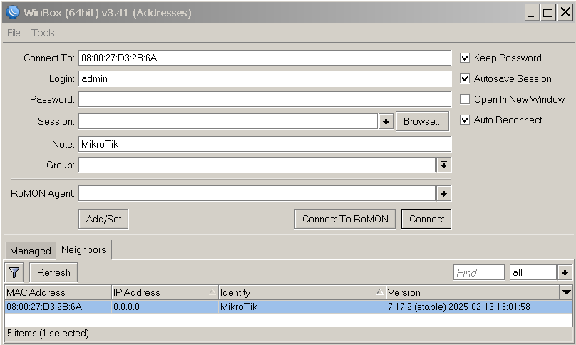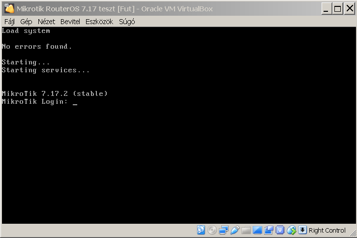 Az indításkor már egy konzol felület fogad minket, akár itt is beléphetnénk (user:admin, password: nincs), de kényelmesebb winbox-al dolgozni.