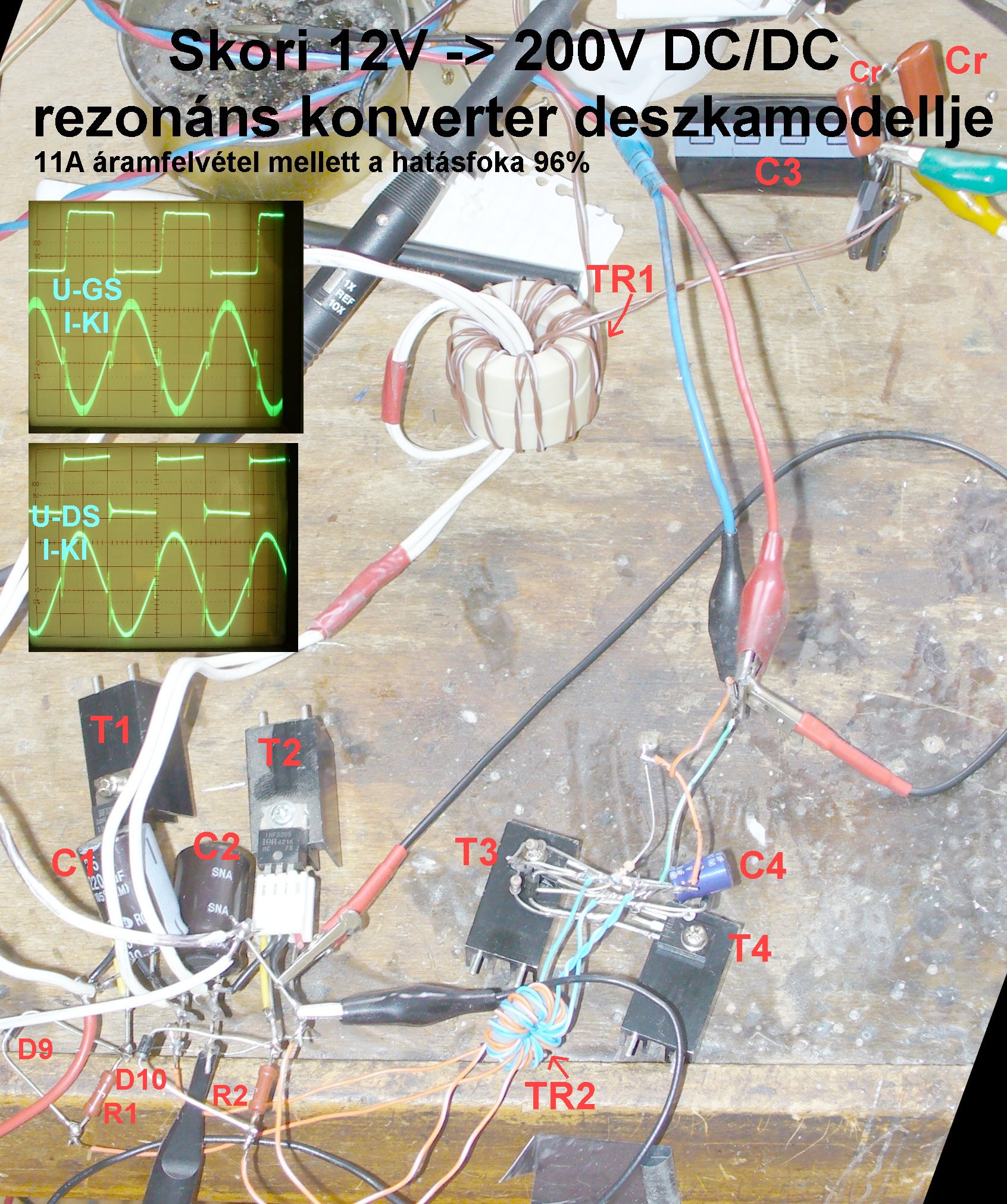 Skori konverter, ez egy kicsit átrendezve ugyanaz a rajz, mint az elõbb. Az elrendezést ránézésre olyan mint egy félhíd. Azonban megtartotta a push-pull elõnyeit. Ilyen kialakítás esetén már problémamentesen alkalmazható rezonáns megoldás is (szekunder oldali rezonáns kondenzátorokkal - melyek egyúttal feszültség-kétszerezõként mûködnek). A megoldás hátránya a fetek nehézkesebb meghajtása. Ez megkerülhetõ ha komplementer FET-párat használunk (egy N és egy P csatornás FET), ilyenkor egyszerû a meghajtás is, de megfelelõ paraméterû P csatornás FET nehezebben szerezhetõ be. A másik lehetõség a transzformátoros FET-meghajtás. Az elkészült deszkamodellben, ez utóbbi megoldást választottam... |